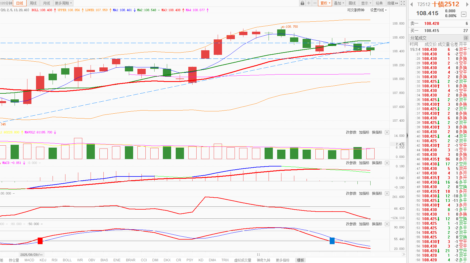今天国债期货日K线收盘后全部在5日均线之下,整体走势偏弱。