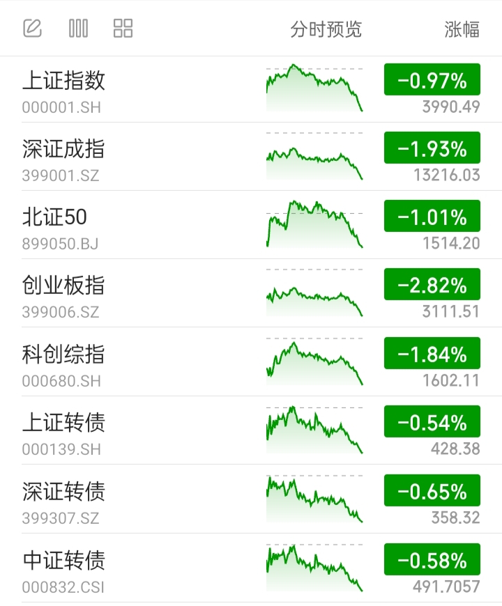A股市场重要指数:全部下跌。今天偏股混基可能下跌