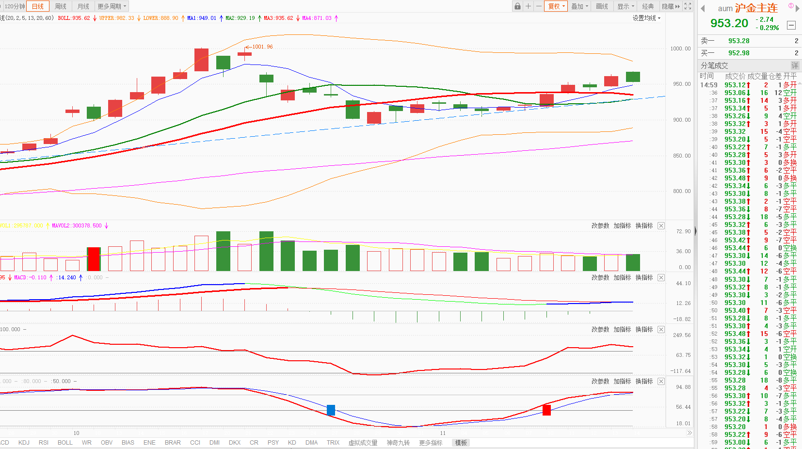 沪金主连:跌0.29%,日K线在5日均线之上。今天沪金下跌,盘中高开低走下探5日均线,短期仍为上升走势,震荡后可能继续反弹。