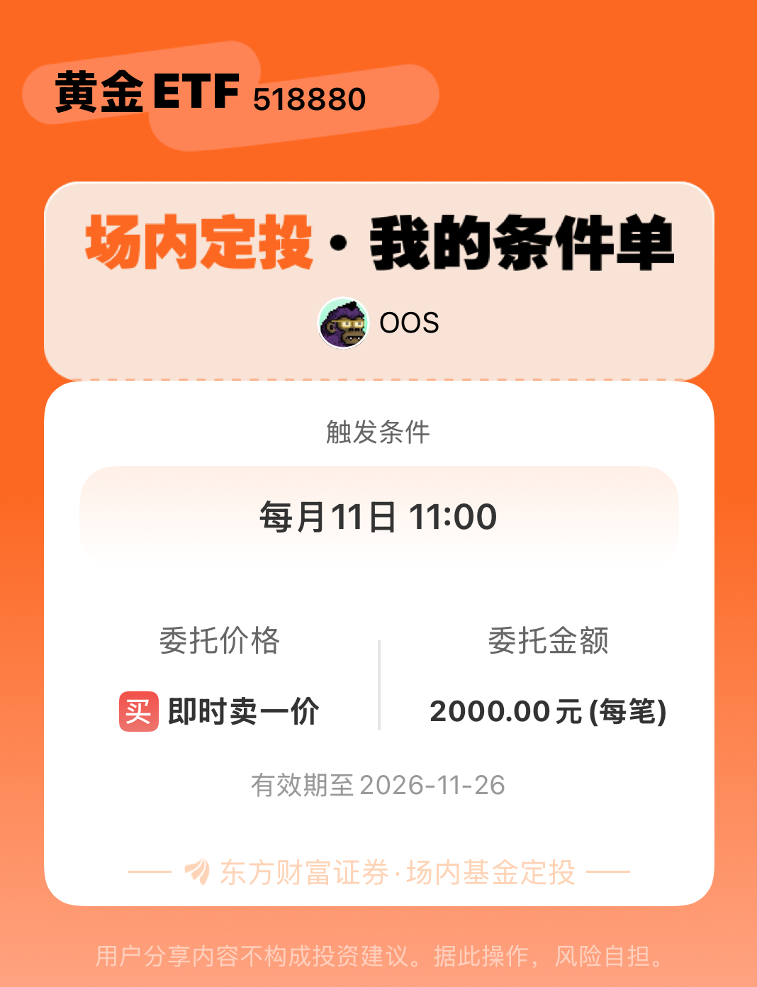 #条件单交流# #场内定投晒单# 一位股神设置了一个场内基金定投条件单,接下来就是见证奇迹的时刻~$黄金ETF(SH518880)$