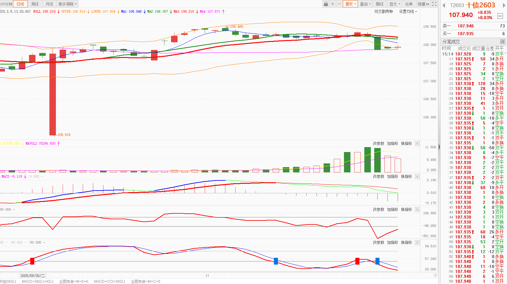 今天10年国债期货高开后冲高回落,午后回稳,整体涨0.03%,日K线在5日均线之下。