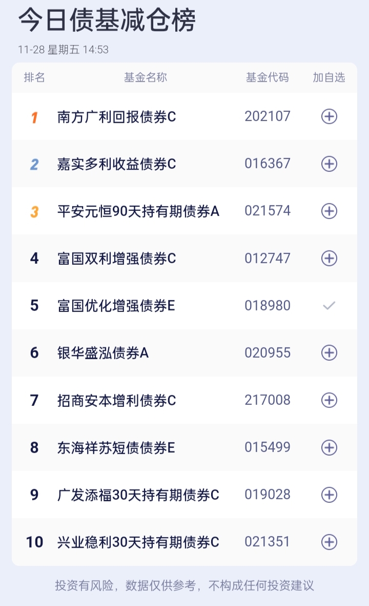 八、债券基金加、减仓榜(截止到15:00收盘)