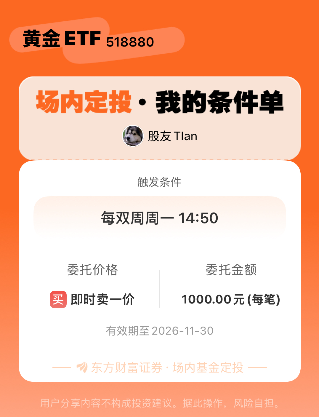 #条件单交流# #场内定投晒单# 一位股神设置了一个场内基金定投条件单,接下来就是见证奇迹的时刻~$黄金ETF(SH518880)$