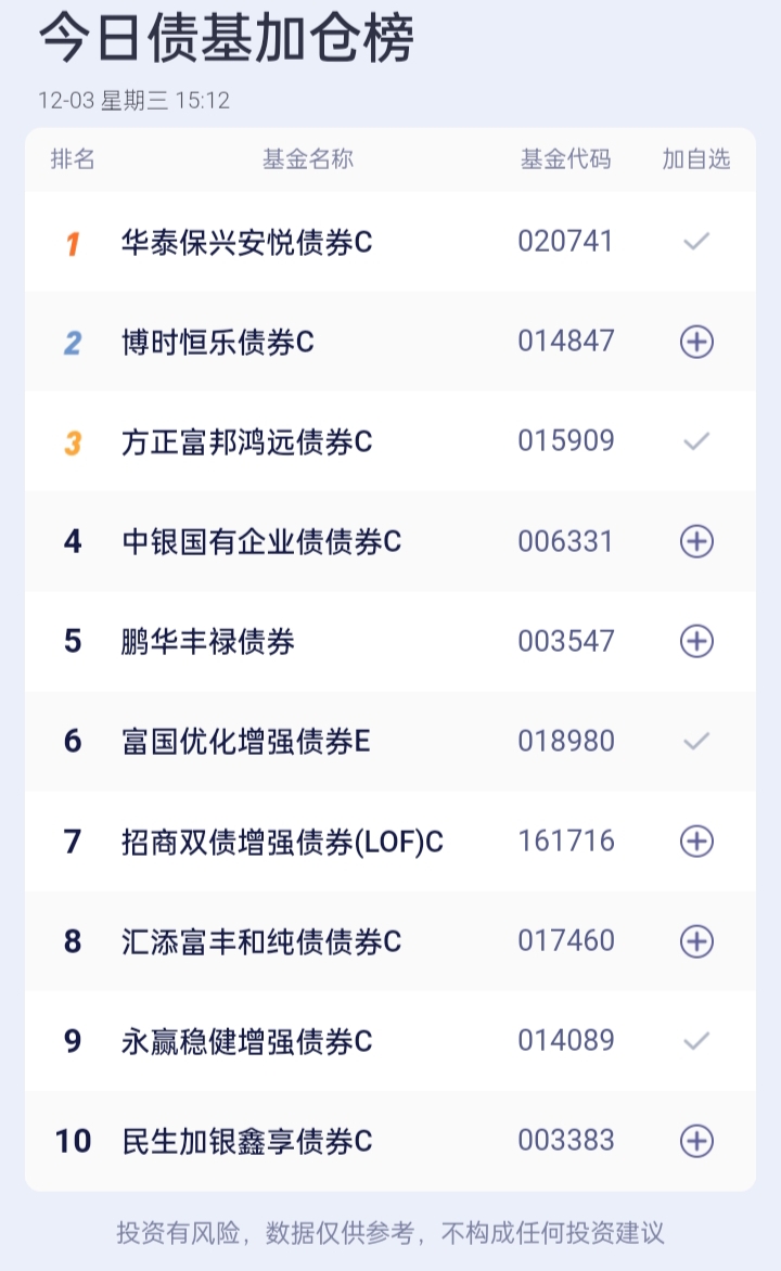 $华泰保兴安悦债券C(OTCFUND|020741)$。$易方达增强回报债券A(OTCFUND|110017)$。$华泰保兴安悦债券A(OTCFUND|007540)$。$永赢稳健增强债券C(OTCFUND|014089)$。$东方添益债券(OTCFUND|400030)$。$方正富邦鸿远债券C(OTCFUND|015909)$。$长城短债C(OTCFUND|007195)$。$富国优化增强债券E(OTCFUND|018980)$。$广发中债7-10年国开债指数E(OTCFUND|011062)$ 。$南方中债7-10年国开行债券指数A(OTCFUND|006961)$