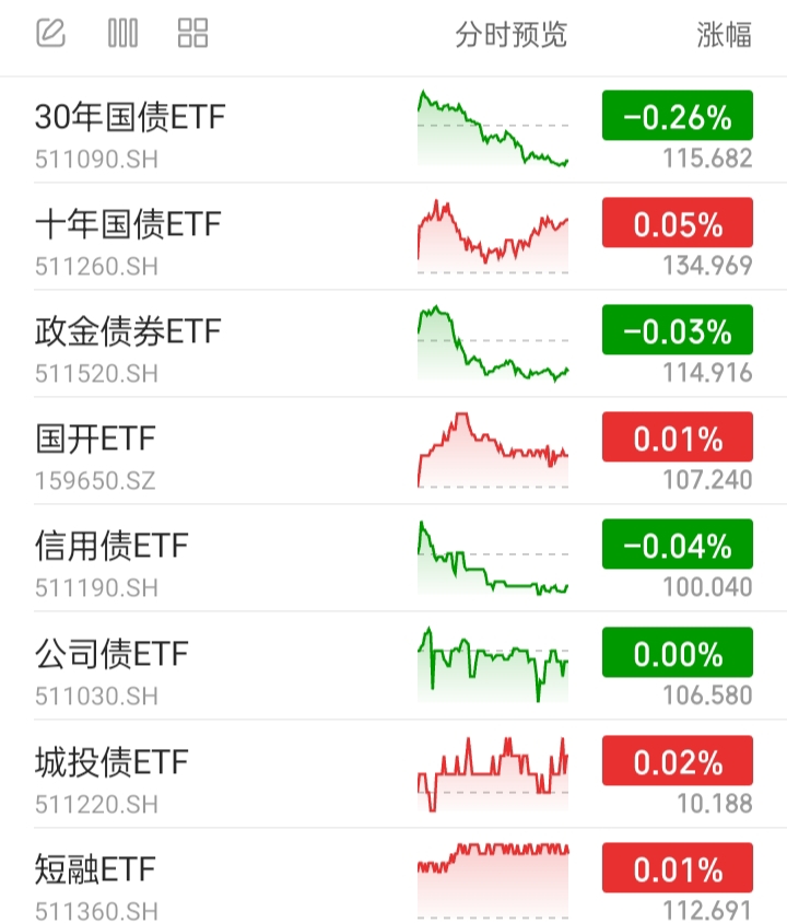 信用债ETF、公司债ETF、城投债ETF,代表信用债基。1平1涨1跌