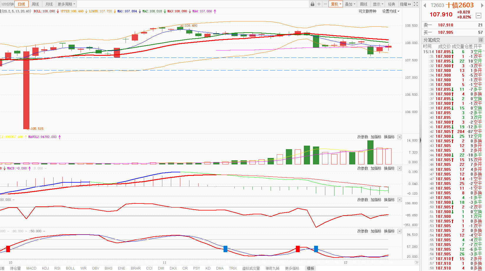 今天10年国债期货低开后震荡上行,涨0.02%,日K线在5日均线之上。