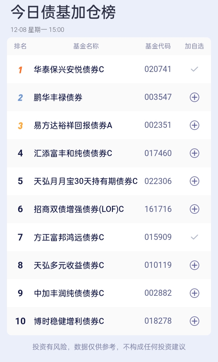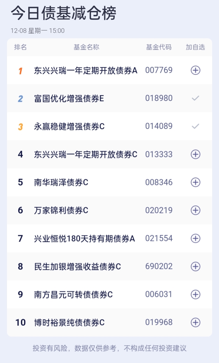 八、债券基金加、减仓榜(截止到15:00收盘)