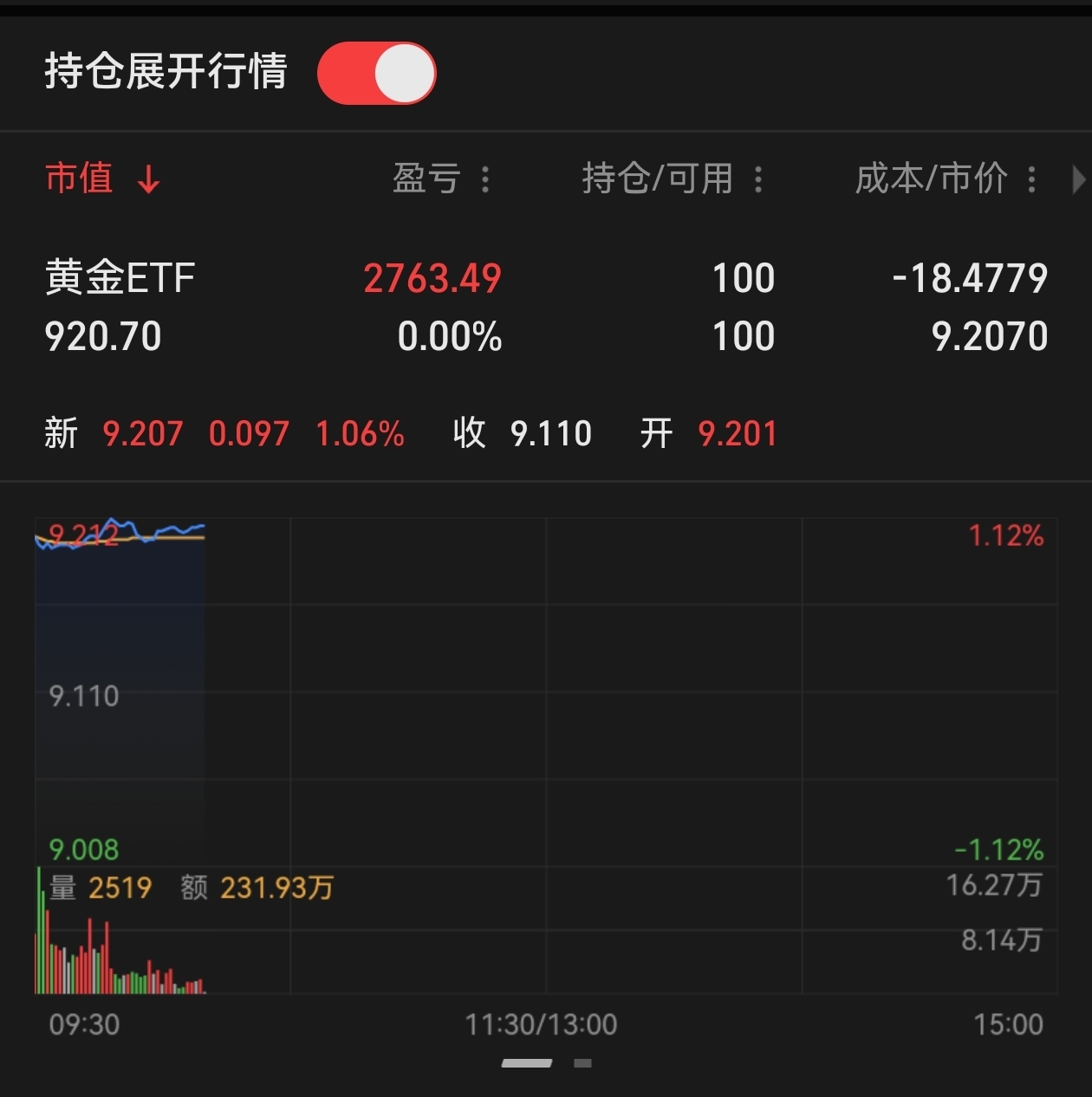 $黄金ETF(SH518880)$ 今天清了,下周能接回来的概率低于50%,心态比较平稳,因为,一落袋为安,保守但稳健,筹码和盈利在手总没错,虽然可能不是最优解(没抛在上涨一波浪高点),二因为有组合,场外资金联结A资金是场内持仓资金的6倍不到,场内下场资金和场内预备队资金1比1,进攻防守组合,所以接下来,顺其自然,不限时间下来就接,不下来就等,等不到就算了,绝不追高