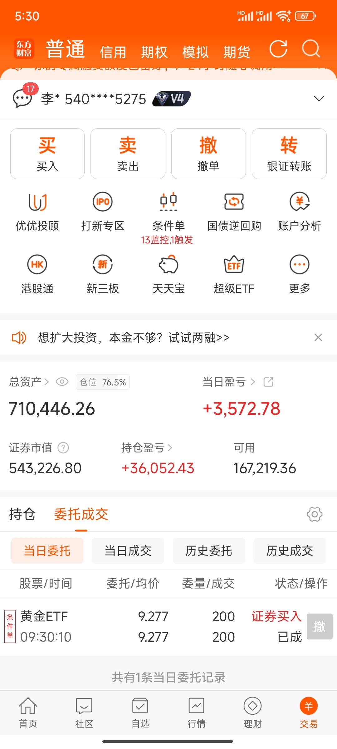 定投第245天,买入黄金ETF200股,今日盈亏+3572,总盈亏+36052。