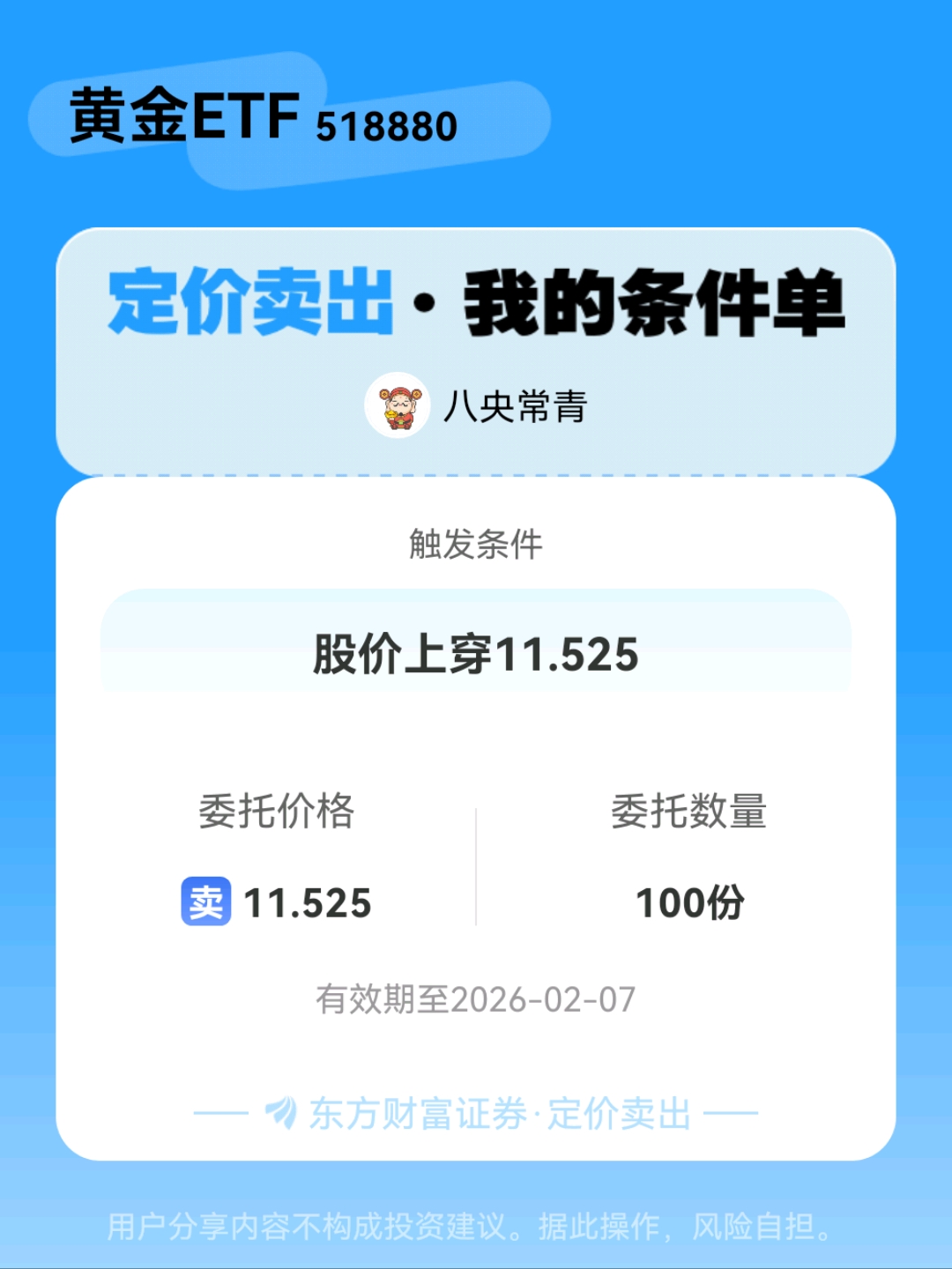 #条件单交流# #定价卖出晒单# 一位股神设置了一个定价卖出条件单,接下来就是见证奇迹的时刻~$黄金ETF(SH518880)$