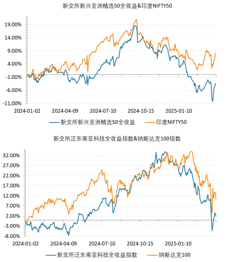 其实从指数走势来看,新兴亚洲50指数和印度大盘的走势更为趋同,东南亚科技指数则和纳斯达克指数走势更为趋同。
