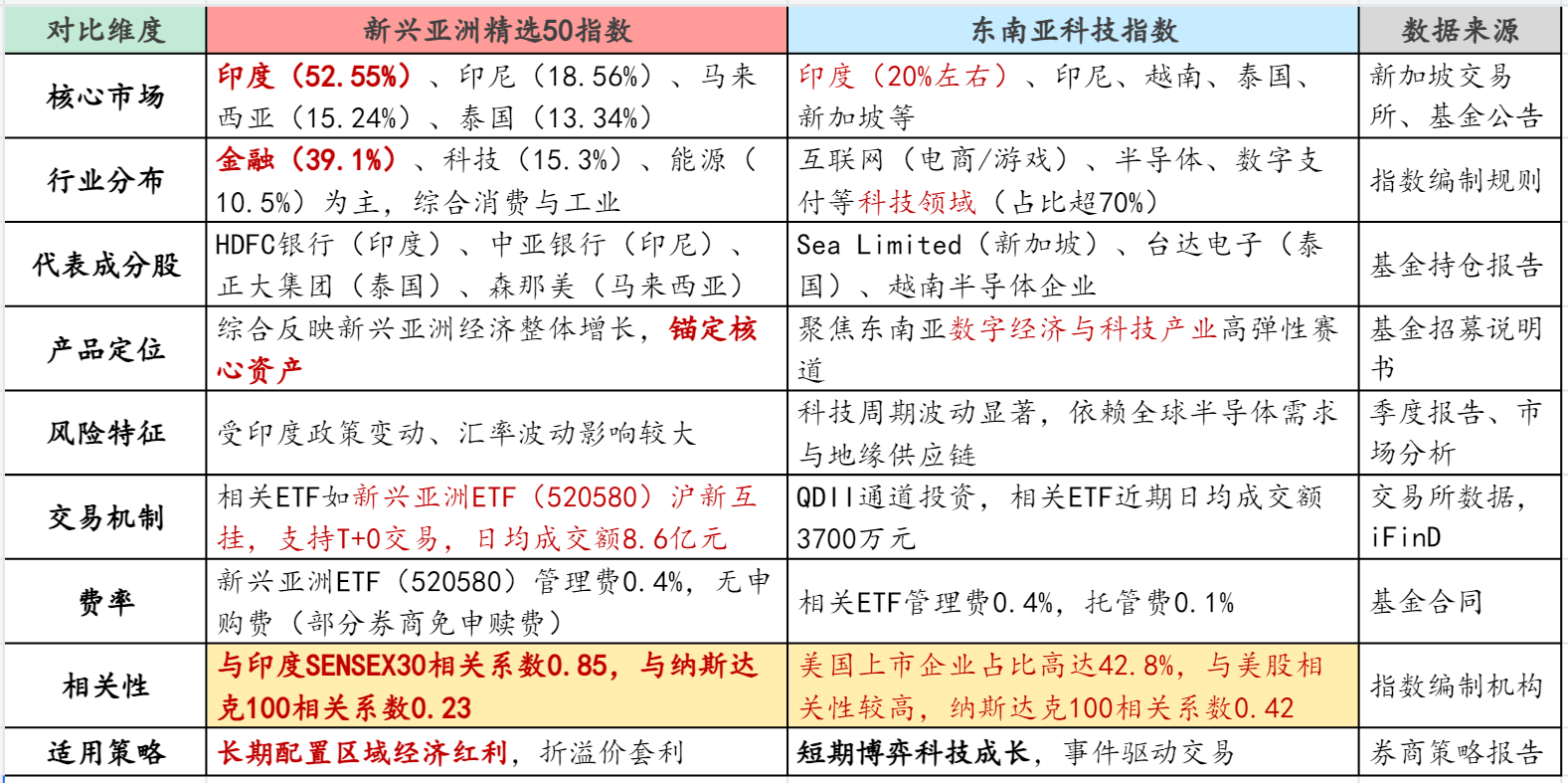 - 新兴亚洲ETF(520580)支持T+0交易,日均成交额8.6亿(2025年年内)流动性很好,远远高于东南亚科技ETF;