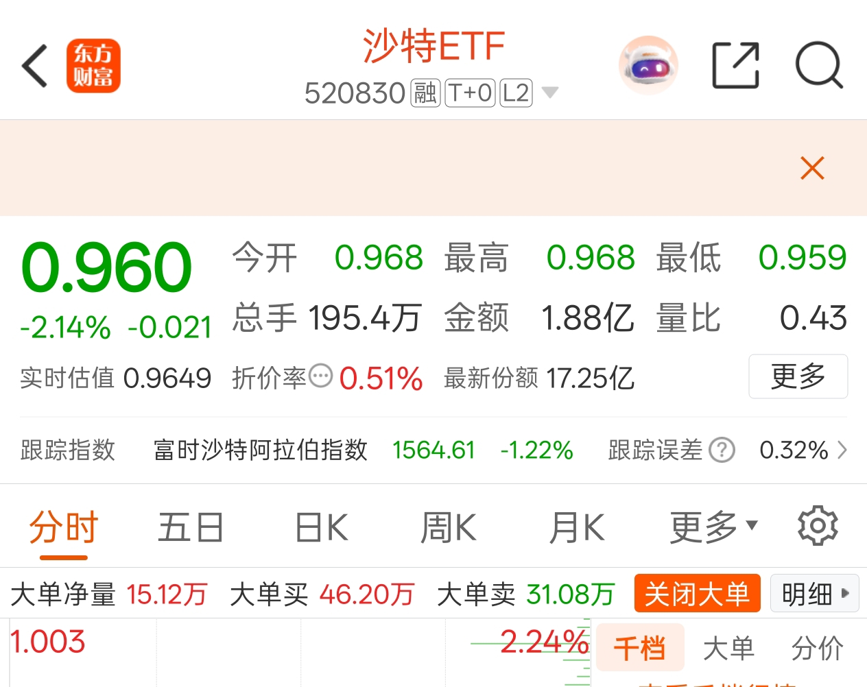 $沙特ETF(SH520830)$ 周一看涨,大户借下跌洗盘完成,主力大单净买入15万手
