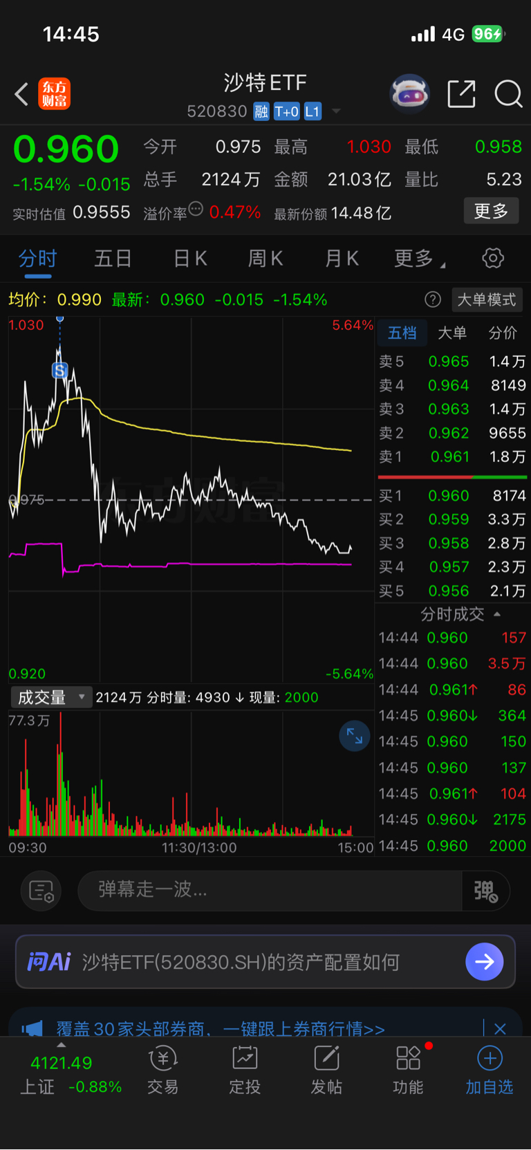 $沙特ETF(SH520830)$ 清仓了,运气好,清在了最高点,1.030。早上开盘前定的价格
