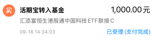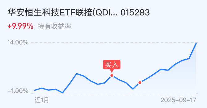 我加仓$汇添富恒生港股通中国科技ETF联接C(OTCFUND|025167)$1000元,美联储如期降息25个基点,预计年内或还有两次降息,跟踪的恒生港股通中国科技指数昨天大涨4.35%,今天盘中再度涨超2.5%,近期表现大幅跑赢其他港股相关的科技指数,利好刺激下爆发力更强,趁这会看翻绿至跌1%左右,我右侧追加一笔。