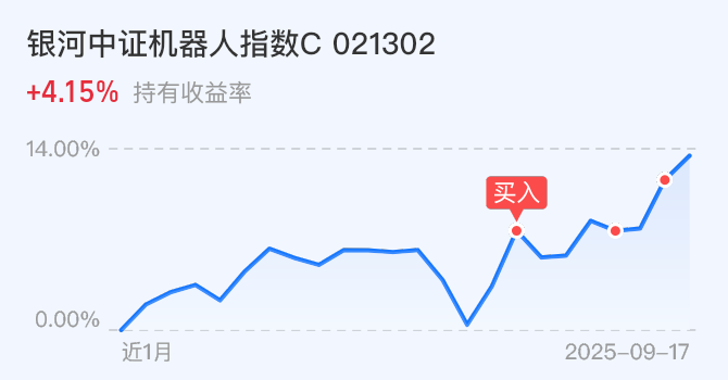 我加仓$银河中证机器人指数发起式C(OTCFUND|021302)$2000元,跟踪的机器人指数这会看翻绿跌0.8%左右,上午盘中续创年内新高,最近一直提到的补涨逻辑如期而至,最近加仓吃到大肉了,趁今天调整我继续加上一笔。