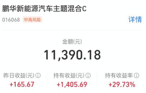 我加仓$鹏华新能源汽车混合C(OTCFUND|016068)$1000元,利好不断刺激下,鹏华新能车前面已经连续上涨3个交易日了,今天盘中净值估算继续大涨超4%!这波行情走的很强势,而且利好刺激也比较多,趁这会看回落翻绿,我直接加仓一笔。
