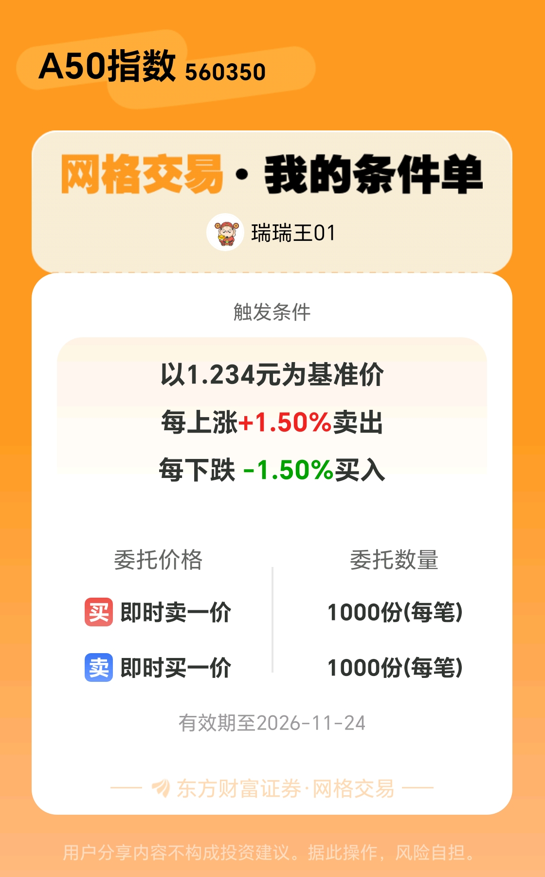#条件单交流# #网格交易晒单# 一位股神设置了一个网格交易条件单,接下来就是见证奇迹的时刻~$A50指数(SH560350)$
