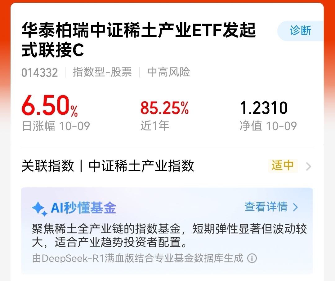 $华泰柏瑞中证稀土产业ETF发起式联接C$ 表现亮眼,今天涨6.5%,一年涨幅85.25%!中国强化稀土产业链控制,相关企业成长空间进一步打开。