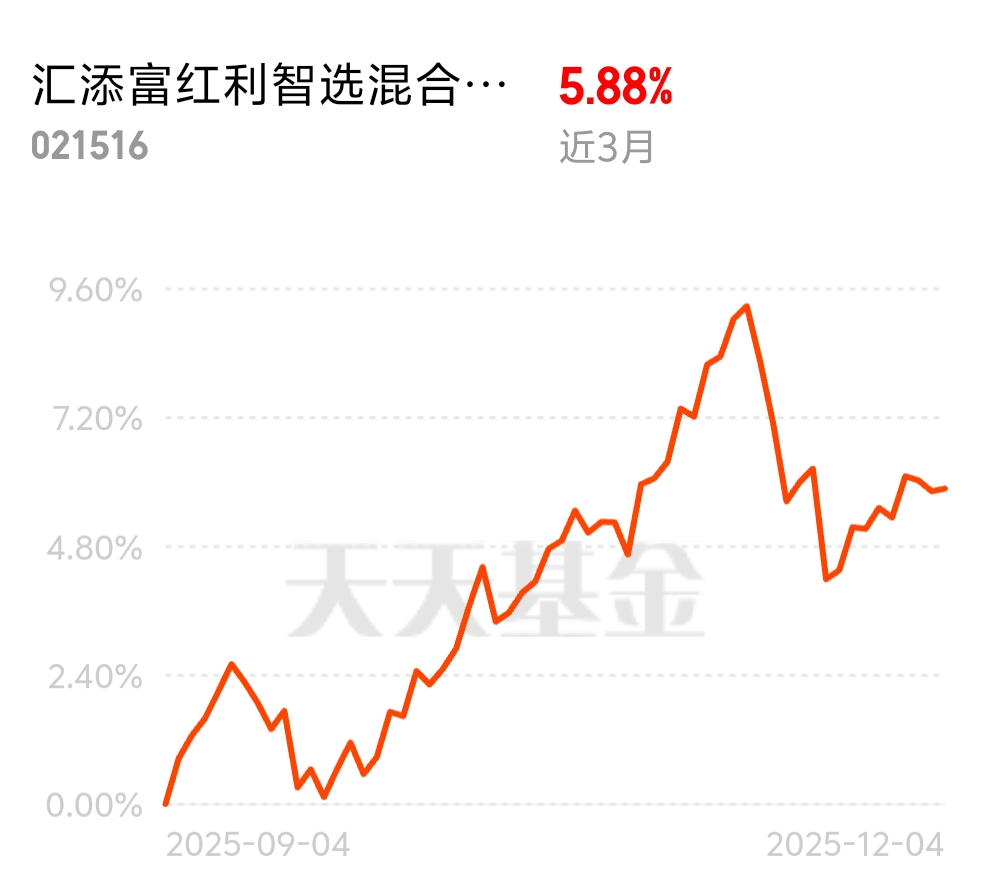 红利板块近期迎来估值修复,资金持续流入,12 月布局正当时。汇添富红利智选混合发起式 C 近 3 个月 5.88%,跑赢港股红利和中证红利,回撤控制一流,经理实盘诚意满满,赶紧冲!$汇添富红利智选混合发起式C$