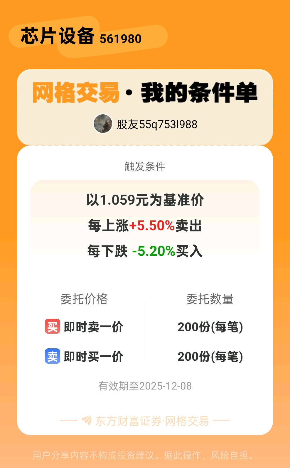 #条件单交流# #网格交易晒单# 一位股神设置了一个网格交易条件单,接下来就是见证奇迹的时刻~$芯片设备(SH561980)$