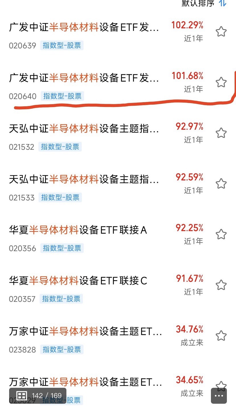 之前对比了好几个半导体指数基金,发现$广发中证半导体材料设备ETF发起式联接C$今天大涨4.51%,近一年业绩比其他比其他同指数高了10%,涨幅也是101.68%,今天材料设备又是全场最靓的仔,说明锐度高的产品在风口上就是冲得快,买它算是买对了$广发中证半导体材料设备ETF发起式联接C$