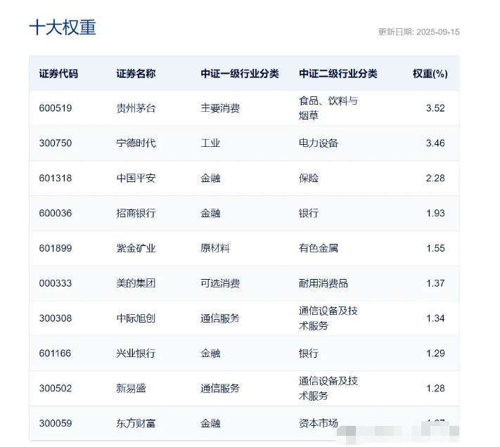 而前十大权重股又聚焦了各个行业里高成长的大市值公司,对全市场的总市值覆盖度约为55%,既兼顾了2000亿以上的大市值公司,又对200亿以下的优质小公司有所覆盖。