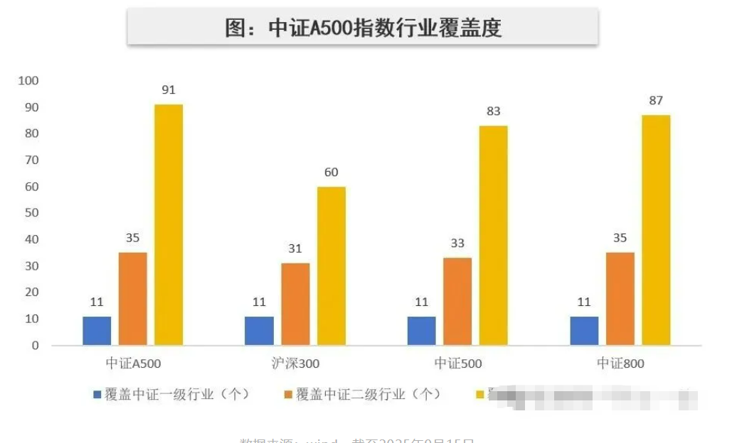 由于,中证A500指数优先选取500只三级行业自由流通市值最大的上市公司证券作为指数样本,更能全面代表A股核心资产走势,同时覆盖91个中证三级行业,超过沪深300、中证500和中证800,覆盖范围的更广意味风险分散度较高。