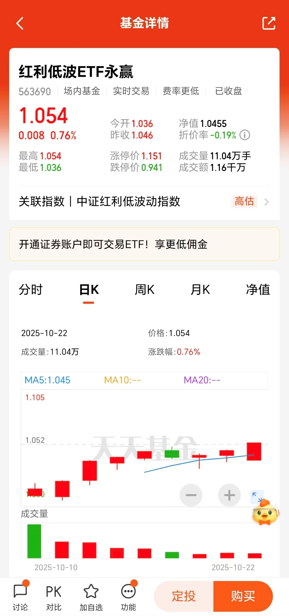 低利率时代,闲钱存银行跑赢通胀都难,更别说让财富增值了。说到这儿,不得不提红利低波ETF永赢这只红利低波产品。这只ETF是跟踪中证红利低波动指数的,指数里都是精挑细选的“高股息+低波动”标的。我查了下数据,它近一周已经涨了1.12%,成立到现在收益率4.55%,虽然不算暴涨,但胜在稳,最近的9天里有8太牛都是上涨的。