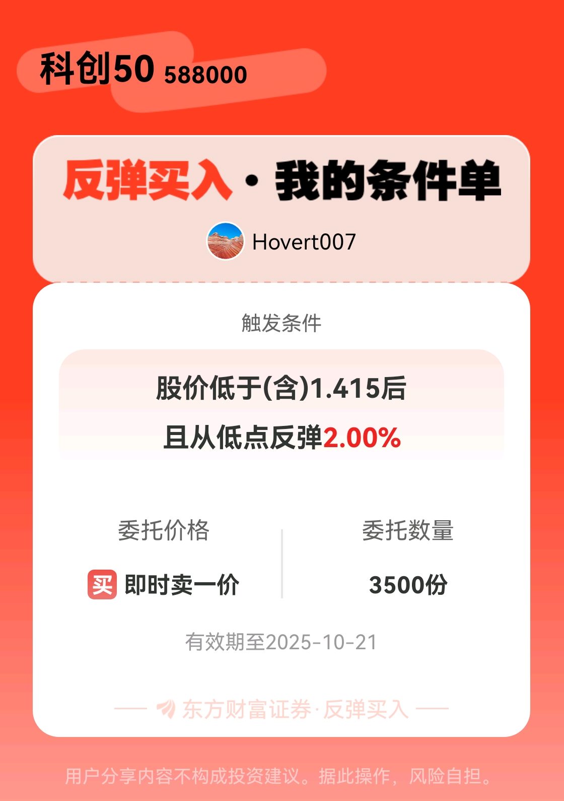 #条件单交流# #反弹买入晒单# 一位股神设置了一个反弹买入条件单,接下来就是见证奇迹的时刻~$科创50(SH588000)$