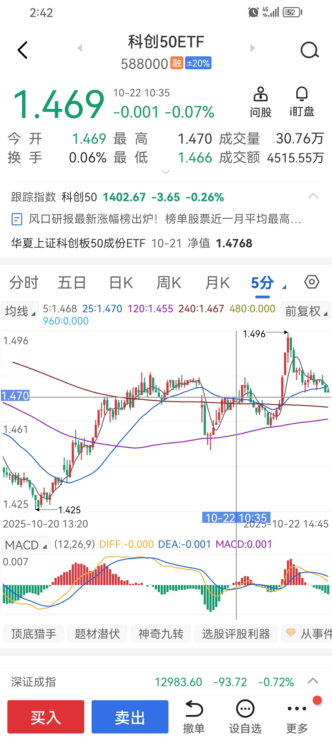 $科创50ETF(SH588000)$ 做T,做价差。以均线金叉作为起始点,然后成本价加一个固定的比例出货的。比如科创50基金588000,5分钟5.20.120三条均线,等20线金叉120线后,并且20线大于120线的前提下,5线金叉20线,5分钟macd指标金叉,就买入1700股,然后加价0.024元卖出,大概是1.7%的利润