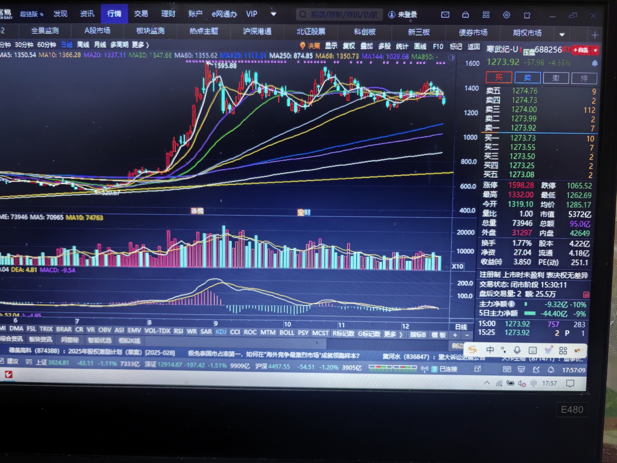 上图寒王日线,前期本人判断寒王向下调整的可能性非常大第一目标1000元上下,但当时正赶上摩尔线程上市主力为了营造高价上市的环境也是拼了,不过该来的早晚会来明天沐曦股份也要上市了静观市场表现吧。