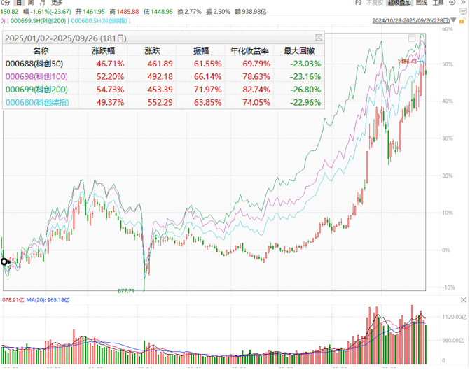 今日科创板F4指数集体调整,但需理性审视其本质——科创50、科创100、科创200、科创综指在昨日创年内新高后的回撤,实为技术周期演进中的正常波动,未改长线多头趋势。以科创100为例,盘中触及1471.87点后迅速回踩10日均线1434点,缩量小阴线形态明确显示抛压源自短期获利盘,主力资金并未撤退。北向资金9月以来通过沪股通净流入科创板超120亿元,,机构持仓周期中位数延长至18个月,印证专业投资者对科创板战略价值的坚定信心。