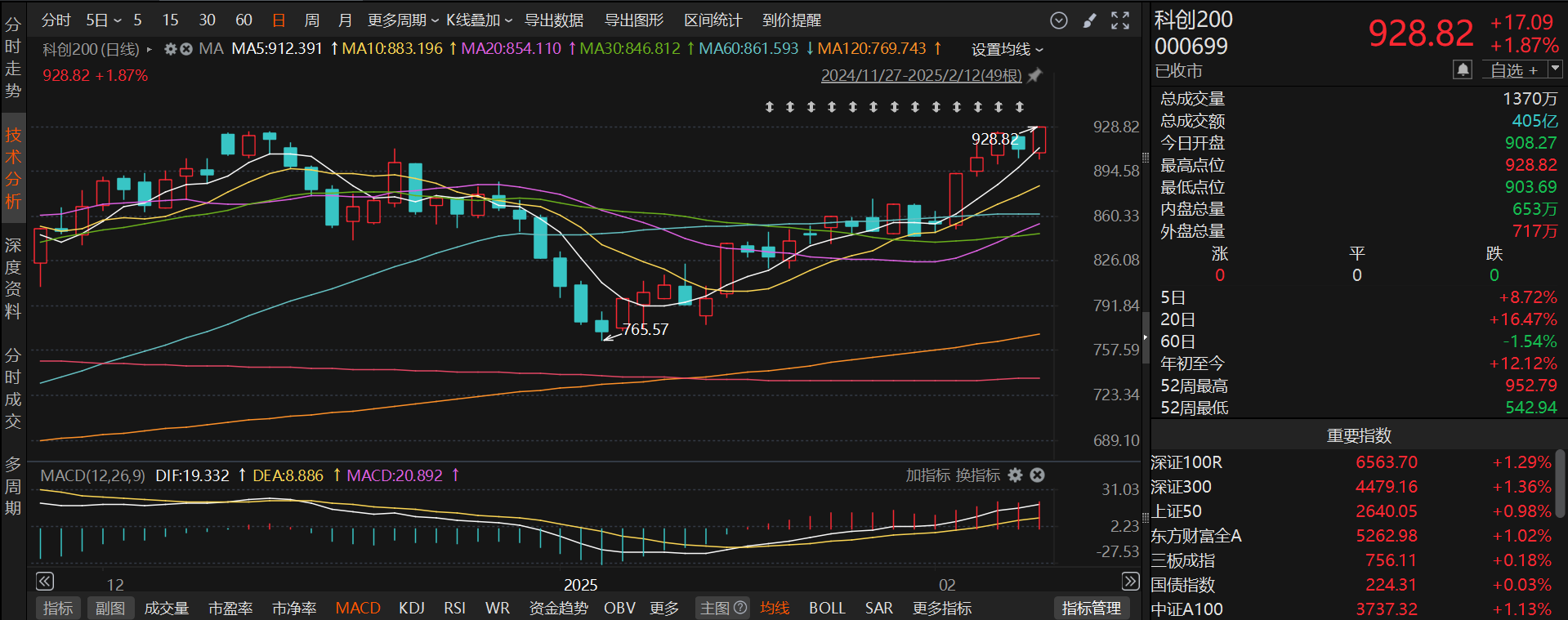 具体分析来看,科创200(000699)截止收盘,整体呈现低开高走的趋势,最终收涨1.87%。结合近几日的K线来看,今日收出的大阳线吞没了昨日的阴线,上涨动能强劲。5日均线迎头向上,短期内快速上涨得到确立。MACD方面已经出现了金叉,并且红柱逐渐延长,后市依然可以看好。