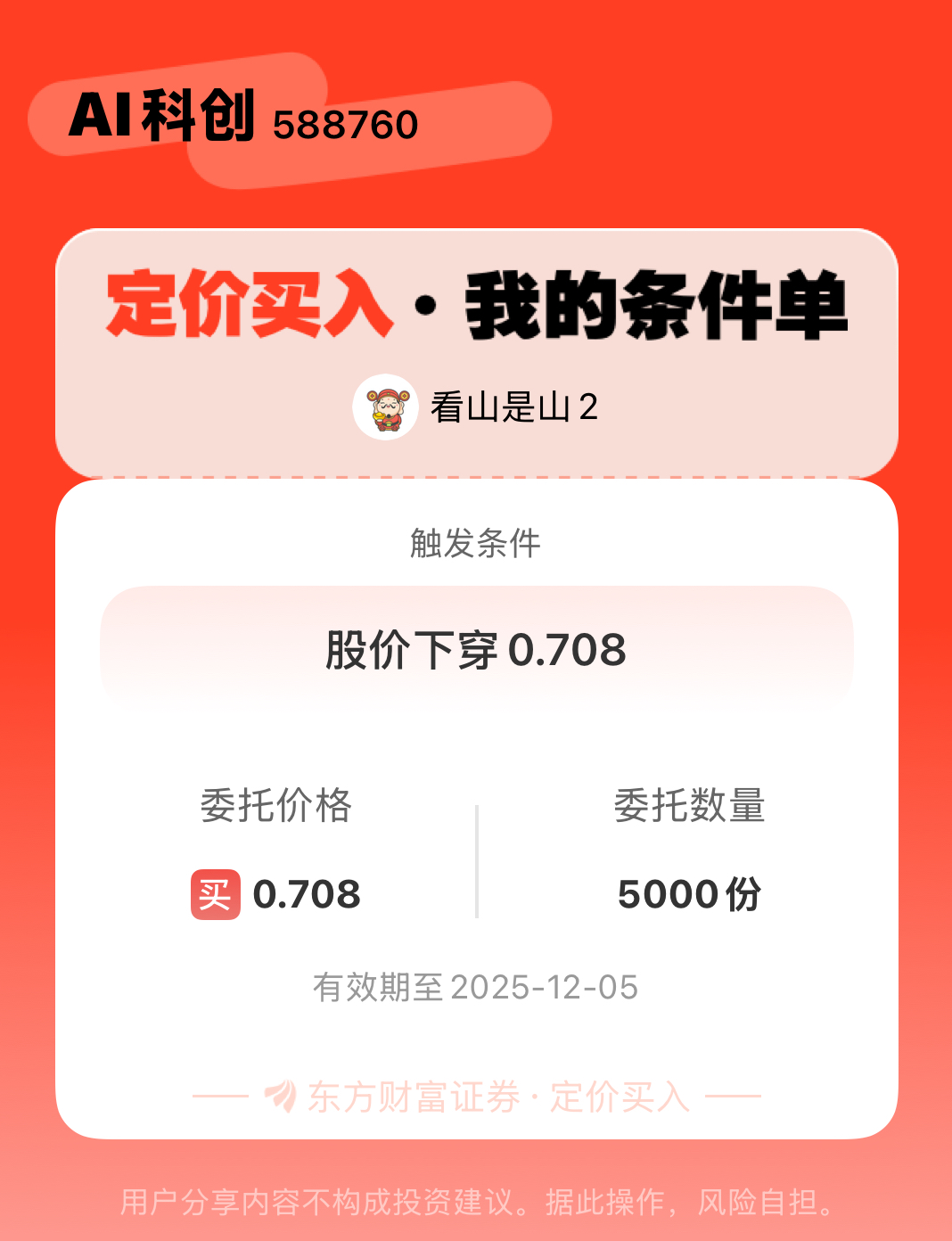 #条件单交流# #定价买入晒单# 一位股神设置了一个定价买入条件单,接下来就是见证奇迹的时刻~$AI科创(SH588760)$