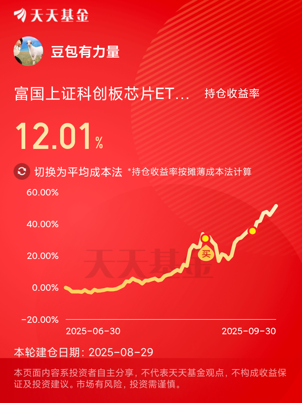 我前面布局了两笔 $富国上证科创板芯片ETF发起式联接C(OTCFUND|023652)$ ,目前的持有收益已经超过了12%。基金追踪科创板芯片指数的表现,寒武纪、中芯国际、芯原股份、澜起科技等芯片产业巨头都有覆盖,涨得也比较好,近一个月上涨了16.06%,近三个月上涨了51.43%,赚钱效应非常好,目前的涨势好,我继续持有待涨了,后续有好机会再来补一补。