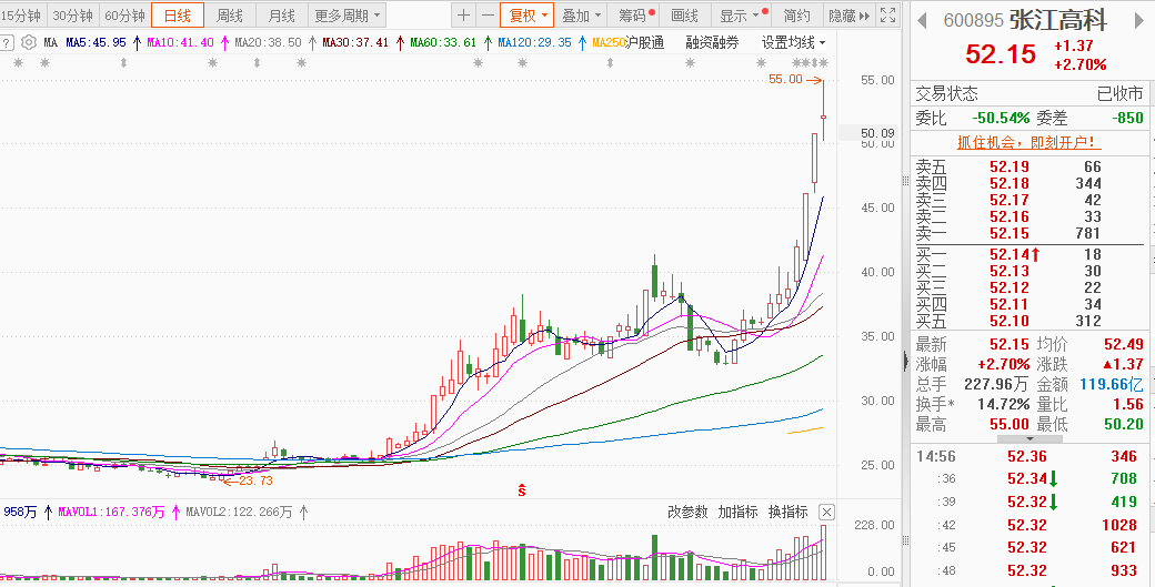 张江高科:芯片光刻机,中国芯片国际正在测试由宇量升制造的深紫外光K机,而且周二芯片半导体是下午市场回拉的时候表现最积极的方向,只不过主要集中在半导体设备材料,张江高科就是典型的代表股之一,龙头股,周四小幅度高开2.7%左右,开盘后有所拉升,但很快跳水回落,反复震荡,收创新高的十字星,有所放量,上涨有所减速,股价偏离趋势支撑均线有所远,看近期是否附近横盘震荡等待趋势支撑上移缩小乖离率后重新爆发先看看。