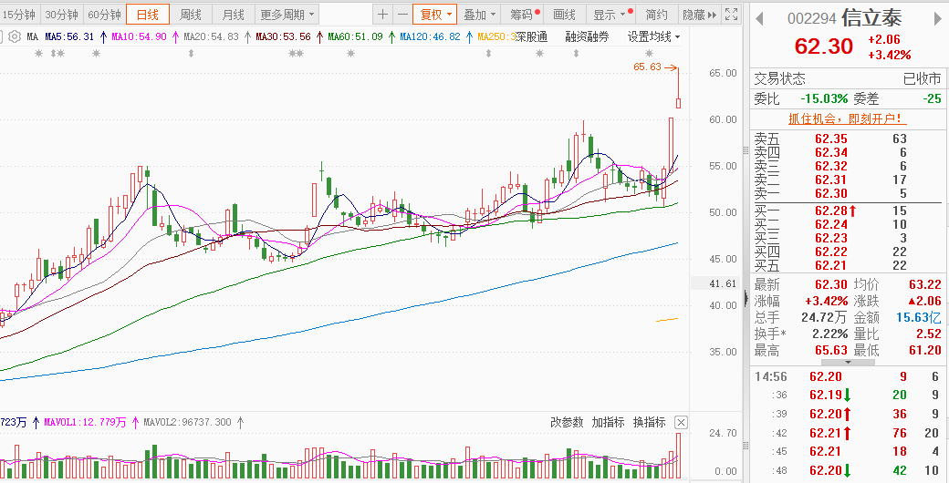 信立泰:创新药,今天信立泰小幅度高开形成突破性上涨缺口选择向上拉升,高开涨幅1.4%左右,方向得到确定,股价有向上加速脱离震荡区间可能,所以上车了,早盘一路拉升最高冲到8%以上,但很快被砸下来,收上影线的阳线,上涨减弱,不过放量收涨,缺口有一定支撑,周五看能否在缺口附近横盘或者修复反包,该股走趋势震荡路线,先看看情况只要不跌破60就行。