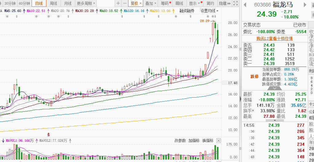 福龙马:今天平开低走,因为是四连板的标的 且断板了,需要观察看看空方的延续性,所以竞价没抓,开盘后不久震荡回落不断新低,需要等不创新低横盘企稳在考虑,但很快就跌停了,不过该股跌停封单只有800多万,很弱,时间在久一点估计跌停就打开了,就算周五继续下跌,空间业有限,而且很有可能低开后10均线企稳高走,形成修复反包,先观察看看后续上涨趋势还有继续爆发可能。
