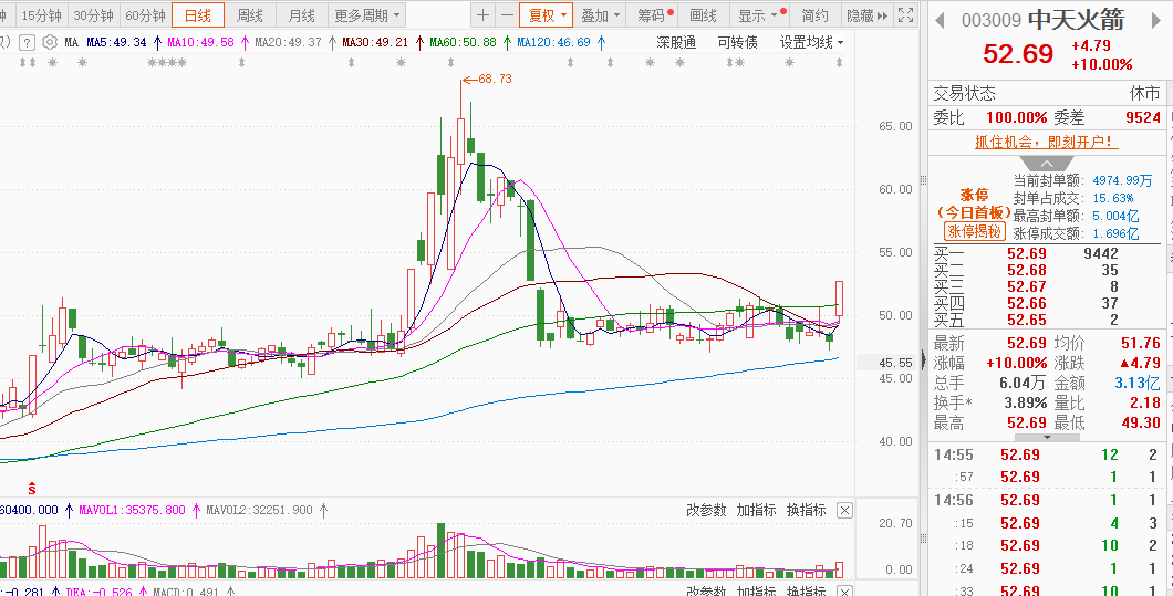 中天火箭:航天概念。四中全会公报提出建设航天强国,加上我国已经进入“十四五”后期,伴随航天强国已经进入到建设落地阶段,有望落地更多的支撑航天产业发展的政策,以及航天产业会有更多资源倾斜。中天火箭国内领先的小型固体火箭生产商,专注于小型固体火箭及其延伸产品的研产销,用友首款20KG级别一下的小型制导火箭,R系列增雨防雹火箭产市占率保持常年第一,公司是国内主要从事探空火箭颜值开发的企业之一,也是我国首批获取飞机炭刹车盘零部件制造人批准书的单位之一。另外股价长期在48附近筑底横盘蓄力,上周五一根大阳线涨停突破了筑底区间,选择向上走拉升,目前刚突破,均线向上处于拉升初期,有继续向上冲锋可能,空间较大。