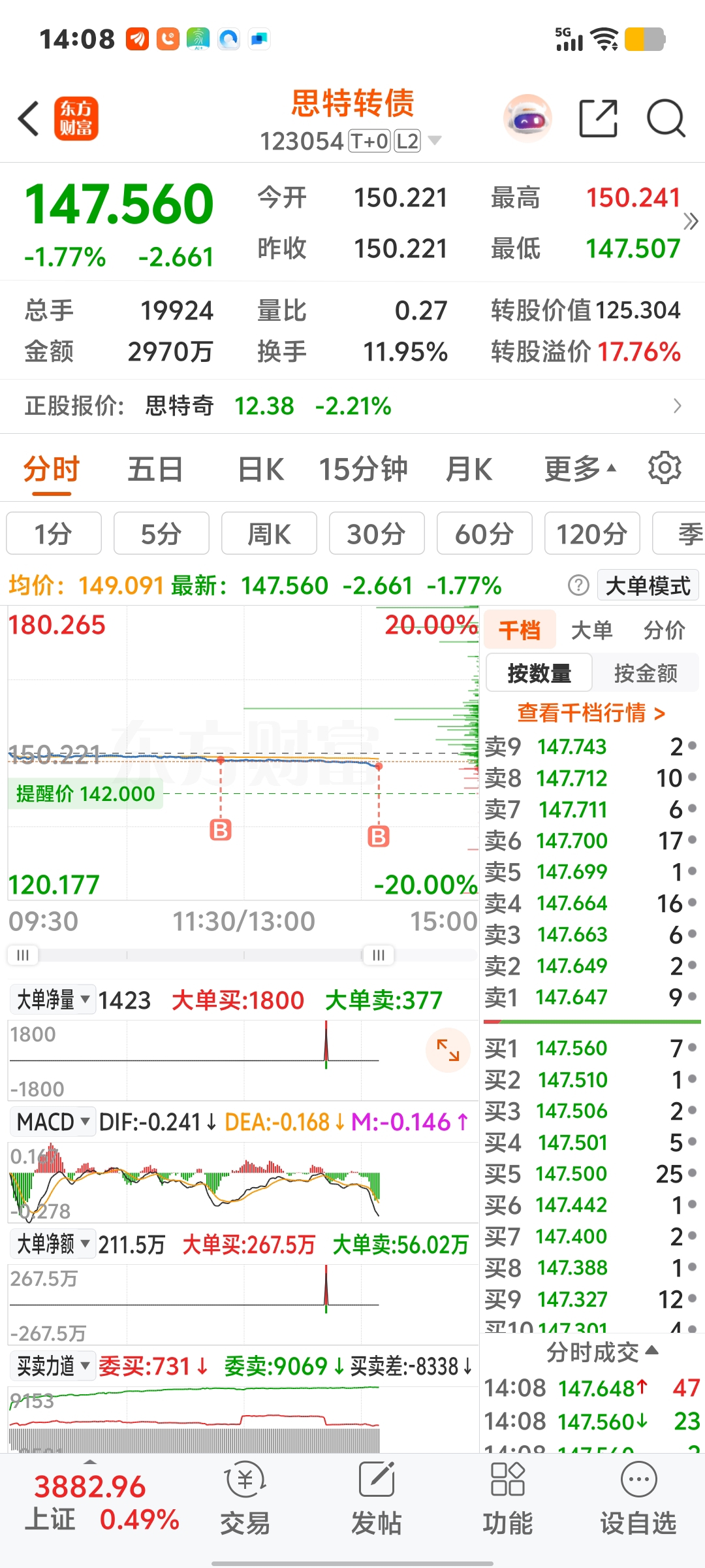 $思特转债(SZ123054)$ 今天补了3000张,到144.47再补4000张,到141.47补1万张
