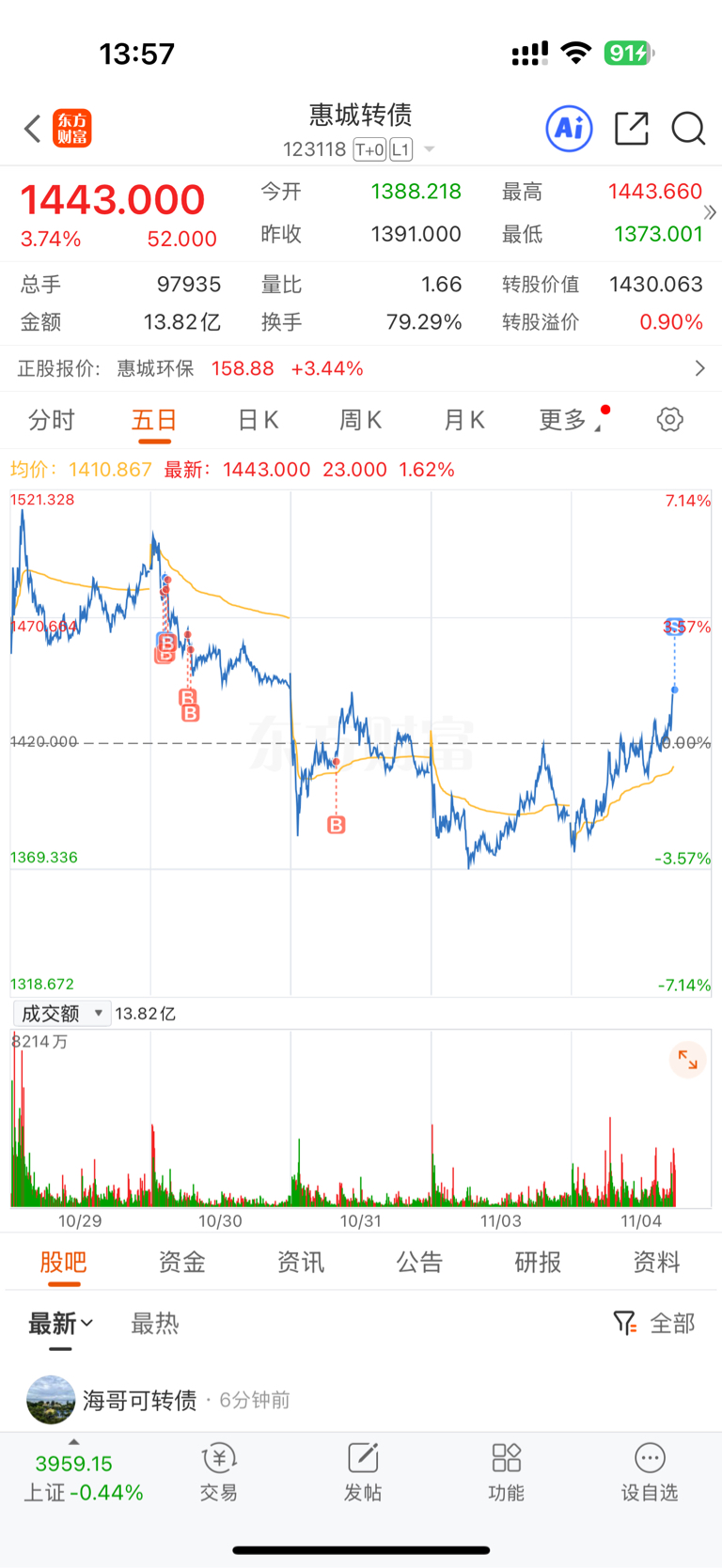 $惠城转债(SZ123118)$ 先走了,一路加仓,变成1441成本~终于走了,不玩了,转债