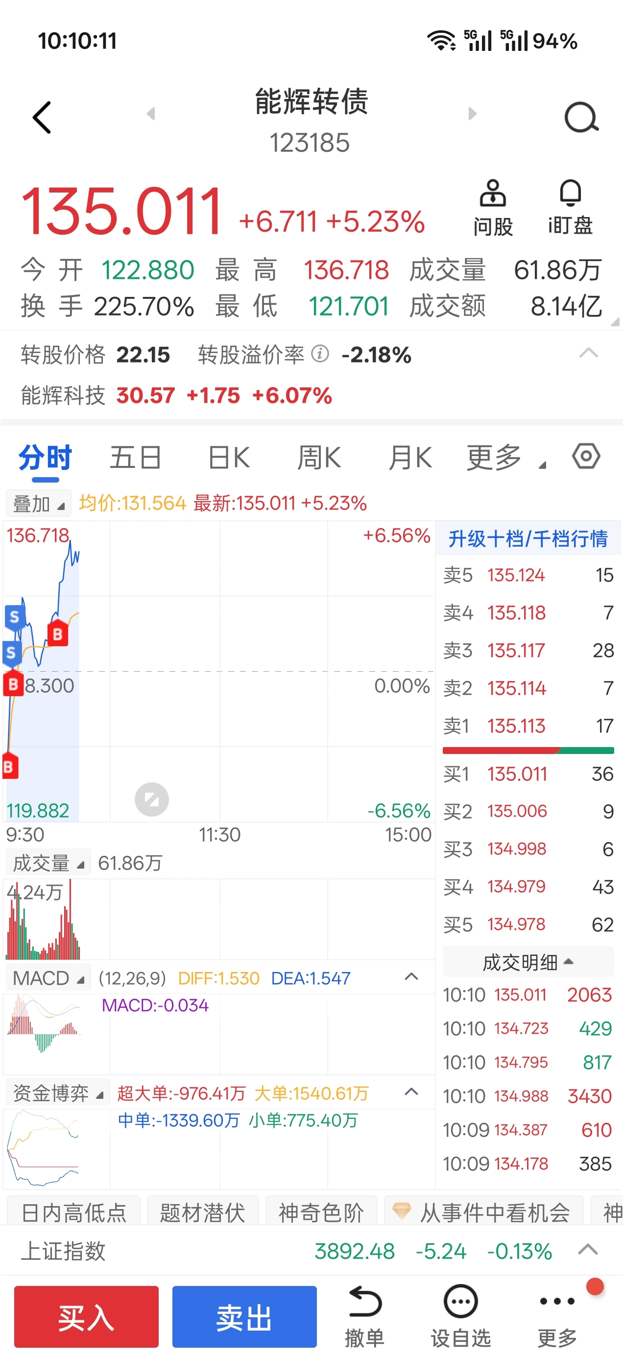$能辉转债(SZ123185)$ 昨天说接强赎超杀,留意122-125附近,结果早盘忘的一干二净