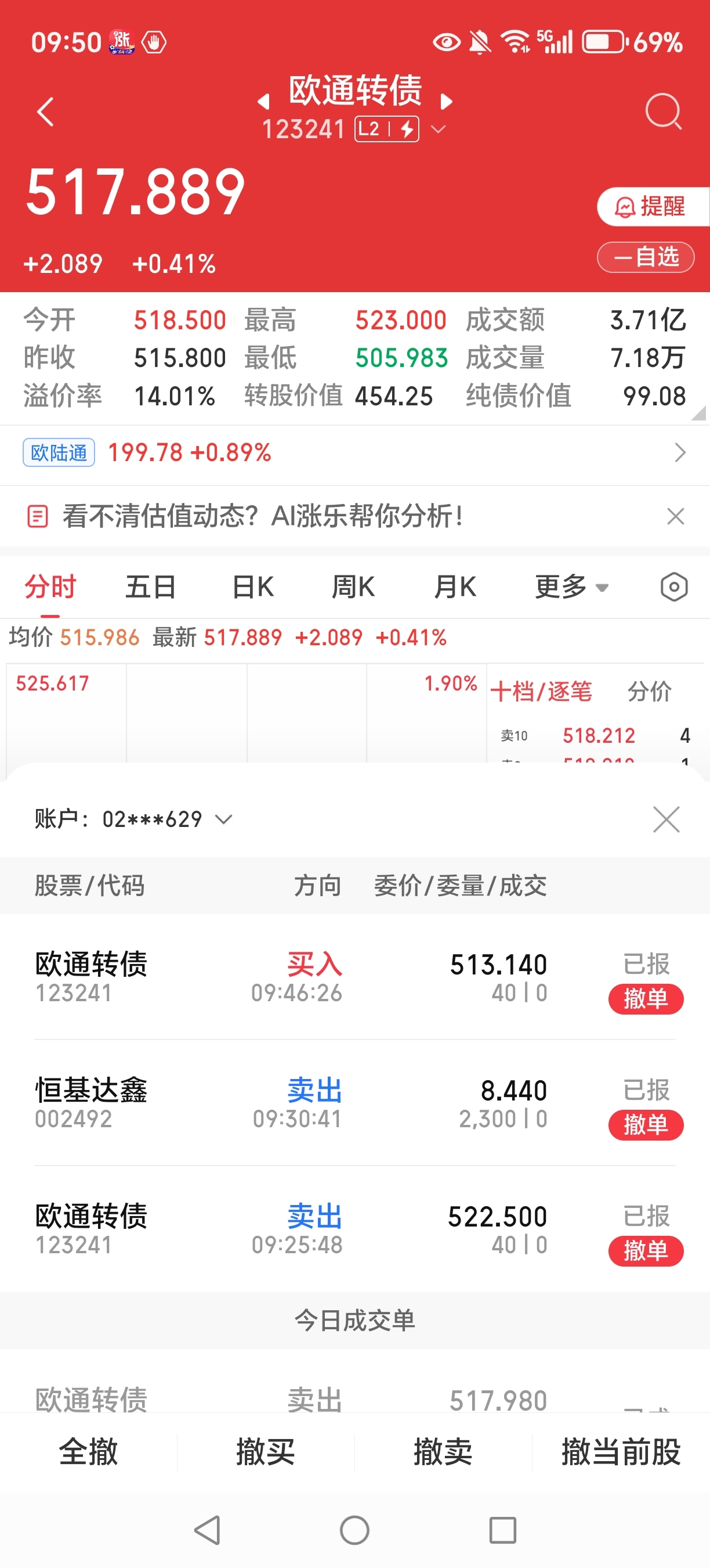 $欧通转债(SZ123241)$ 真神奇我提前挂单了522.5卖出!最高价523。居然没有成交!有谁懂是什么原因吗?