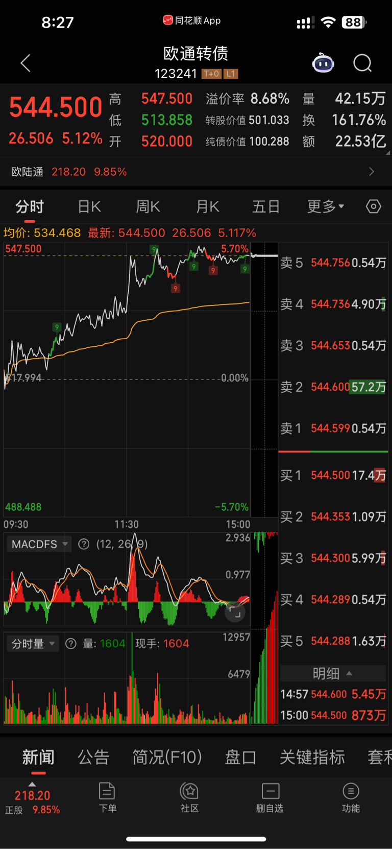 $欧通转债(SZ123241)$ 尾盘买单很多,明天高开
