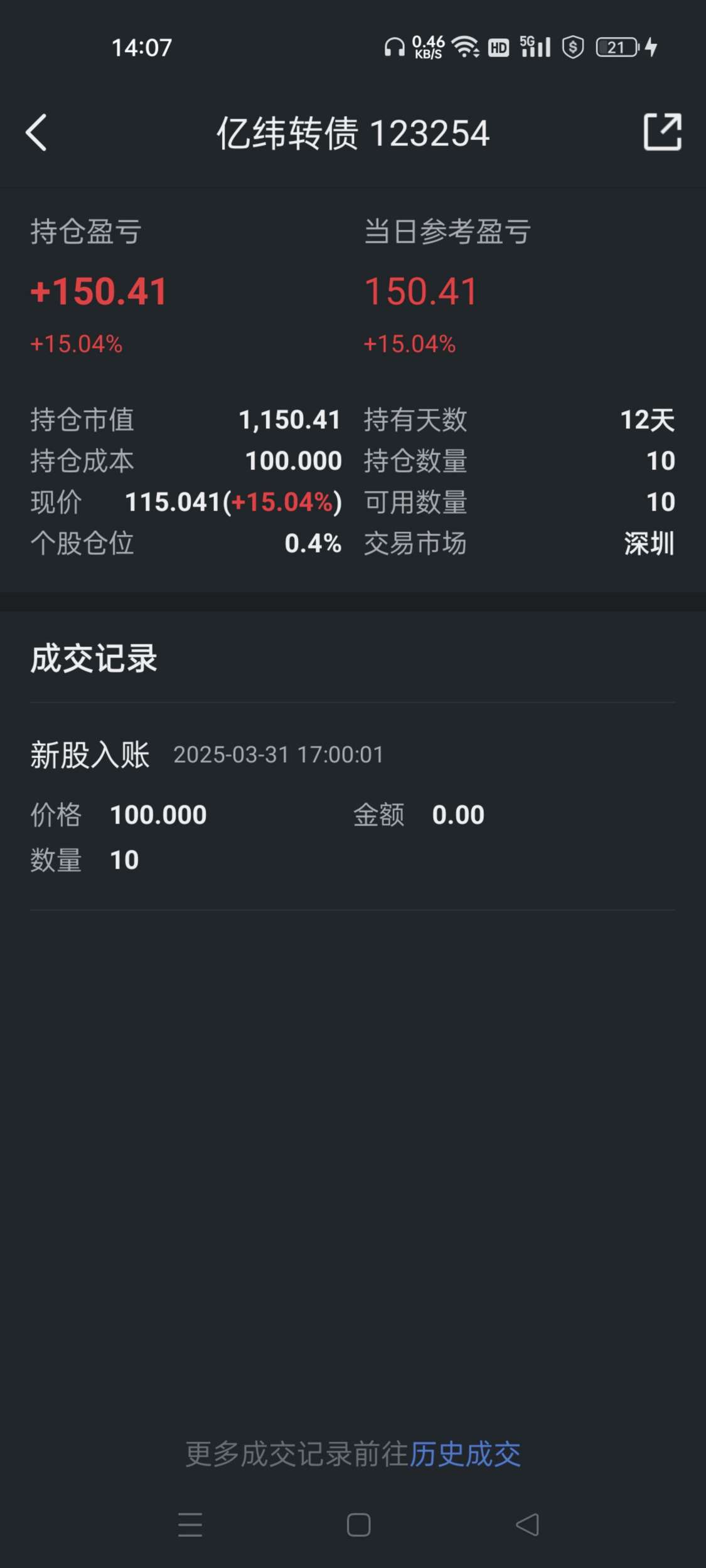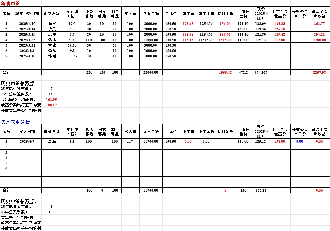 亿纬中了11手,为了便于管理,以115.16的均价卖掉了10手,留一手看看最后到期前可以出现的任何情况!以后所有中签债在到达预期的签均统统保留一手看戏。没中签的债,开盘低于预期的统一买进,做长线持有。