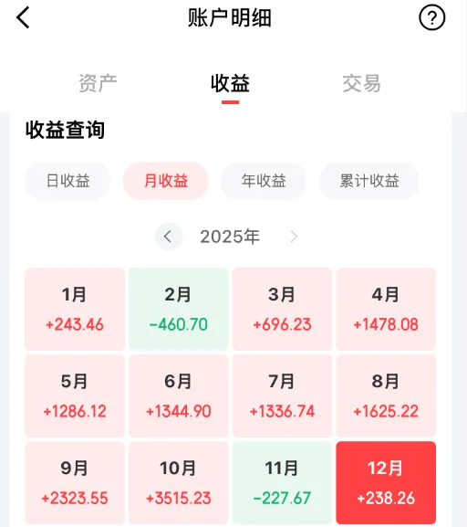 年内11个月出头,只有两个月亏损,2月和11月分别亏损460.7元和227.67元,其余月份全部赚钱,年内累计赚了13399.4元。