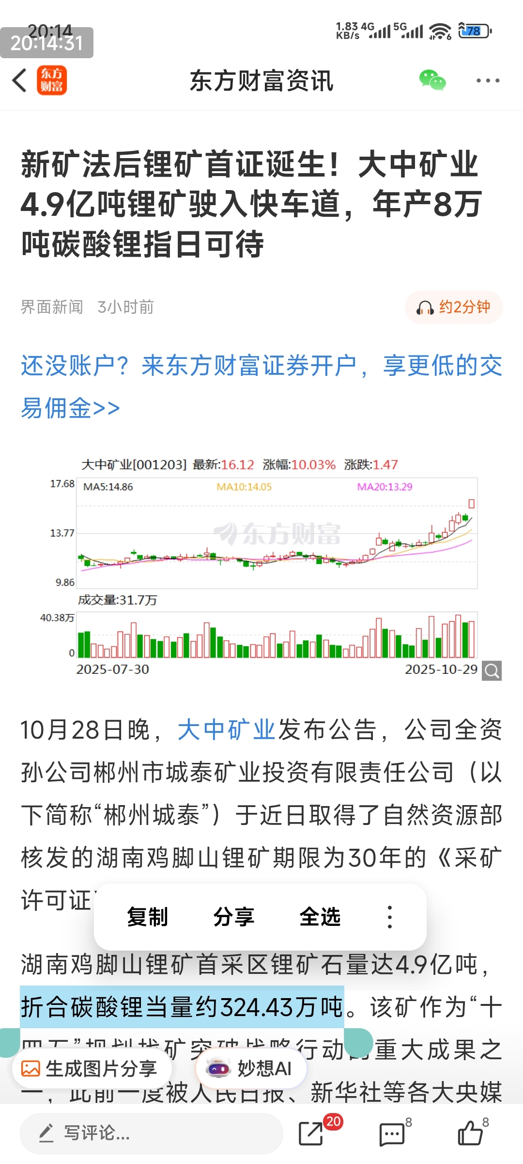 鸡脚山锂矿折合碳酸锂当量约324.43万吨,按当下碳酸锂每吨8万元计算,价值约2