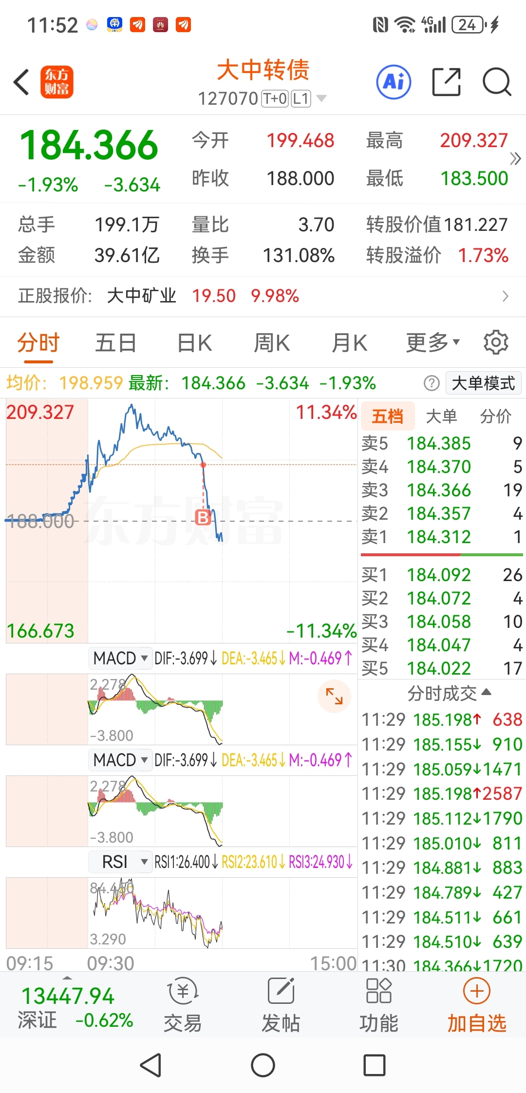 $大中转债(SZ127070)$ 197.80刚买了360张,去厕所大便一趟回来就跌这鸟样,以后不能玩转债了,基本上玩小赢大亏…此债下午要不要割肉?请高手指导一下,谢谢!