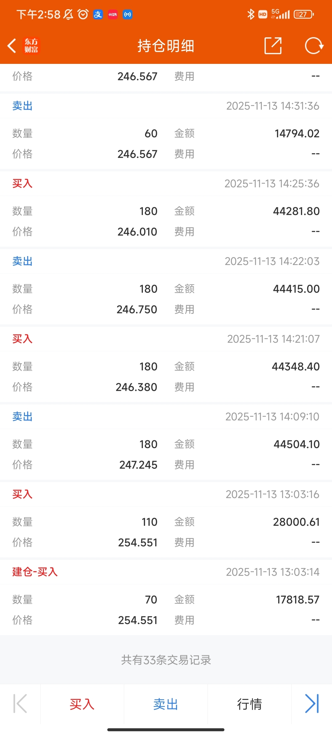 今日成交股票:操作原因:手就是贱254.5买的,做T到250,希望明天给我个机会